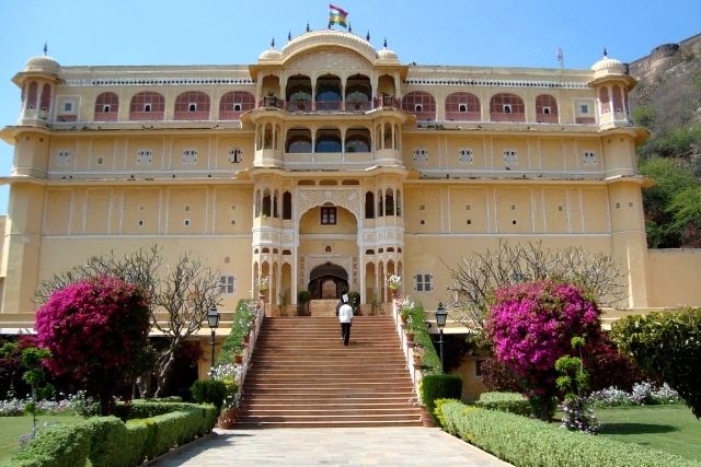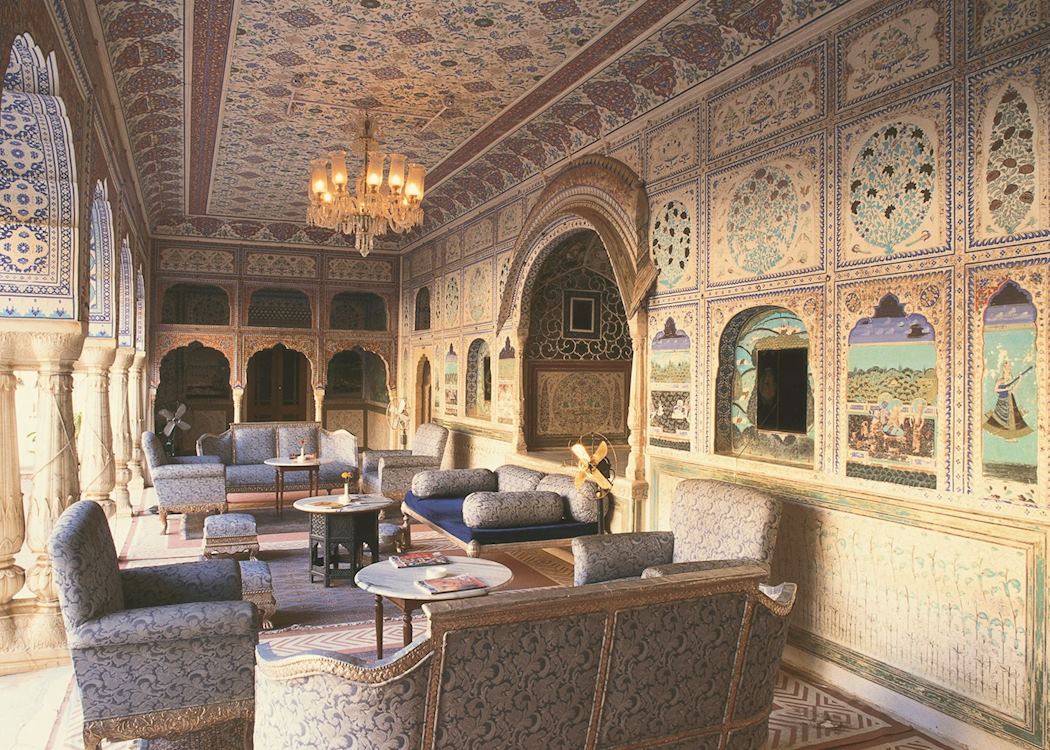 The Samode Palace, now a heritage hotel, is built in the characteristic pattern of an open courtyard with rooms leading off the arched corridor that runs along all the four sides of the building. The Sultan Mahal is on the first floor-an exquisite room with a marble pillared verandah. It has the famous Jaipur blue tile decorations. Every inch of the ceiling and the walls are covered with floral, paisley and geometric motifs painted in vegetable colors. It is called Sultan Mahal after the craftsman, who painstakingly created it. Old and heavy carved silver furniture brought from Nepal by the grandmother of the present Rawal gleam dully in sunlight even today. To the left of the main haveli is the Durbar Hall, which was built about a hundred years ago. Again it is painted with ornate floral motifs and colored delicately with vegetable pigments, which still have a special glow of their own.